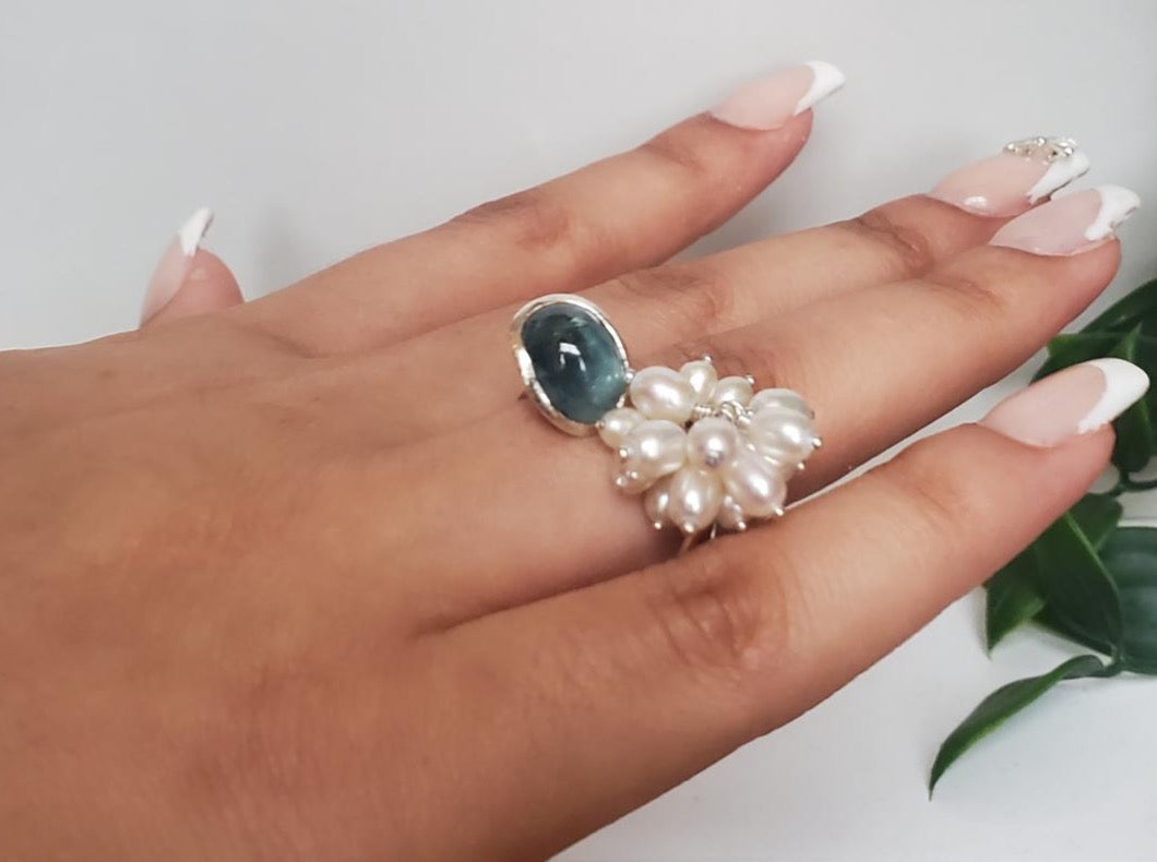 A beautiful rich blue aquamarine cabochon ring set with a wavy edge in an open tapered silver band. Named after the colour of the sea natural inclusions typical in aquamarine accentuate the watery, ever changing appearance. On the other side is a cascade of oval white freshwater pearls which subtly move.