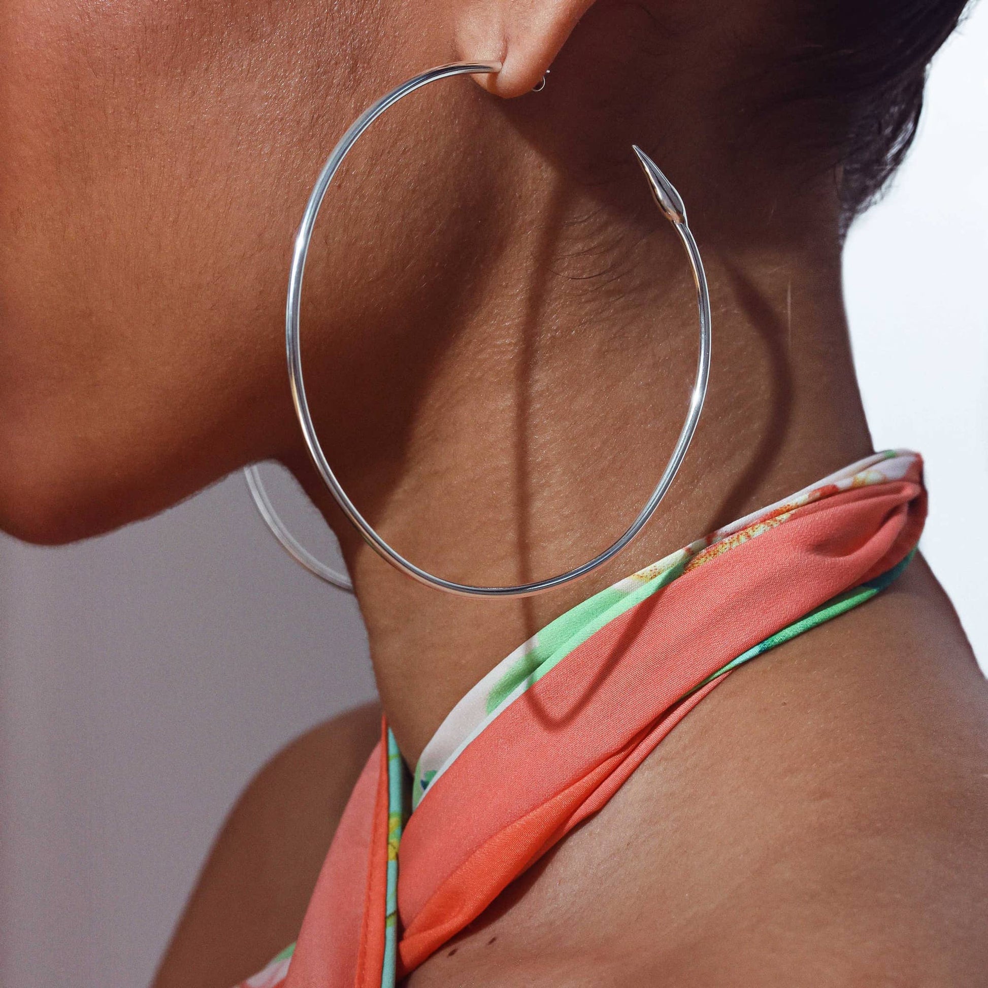 Solid sterling silver hoops which feature an arrow shaped seed at the ends giving the hoop earring stylish detailing. They're available in a medium 55 mm diameter and large at 75mm to get you noticed. Please select size at checkout. The first 2 model images show the large hoops, the third and fourth are the medium sized.