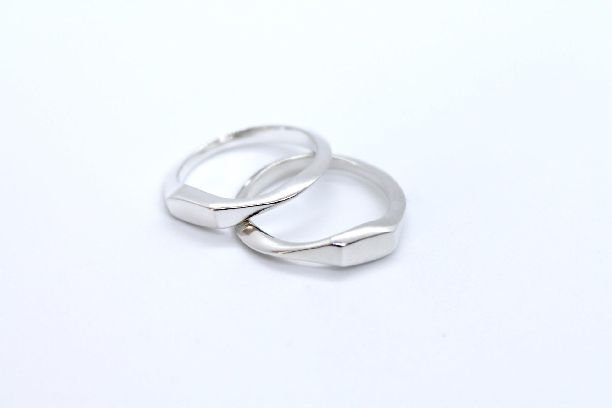 A silver ring with an unusual asymmetric design and a knife edge taken from a curved mountain ridge.