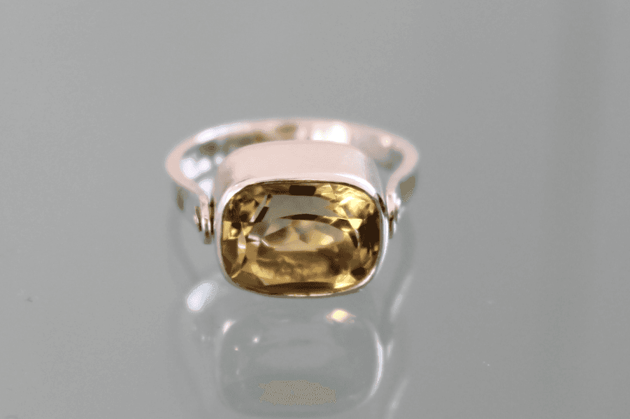 12x10mm lemon quartz, which swivels in the band. This is a version of an ancient style, the swivel ring, of which there are Egyptian, Greek and Roman examples. Made in silver this swivels through 360 degrees and is a statement piece. It's shown centrally worn with other swivel rings. This one is available.