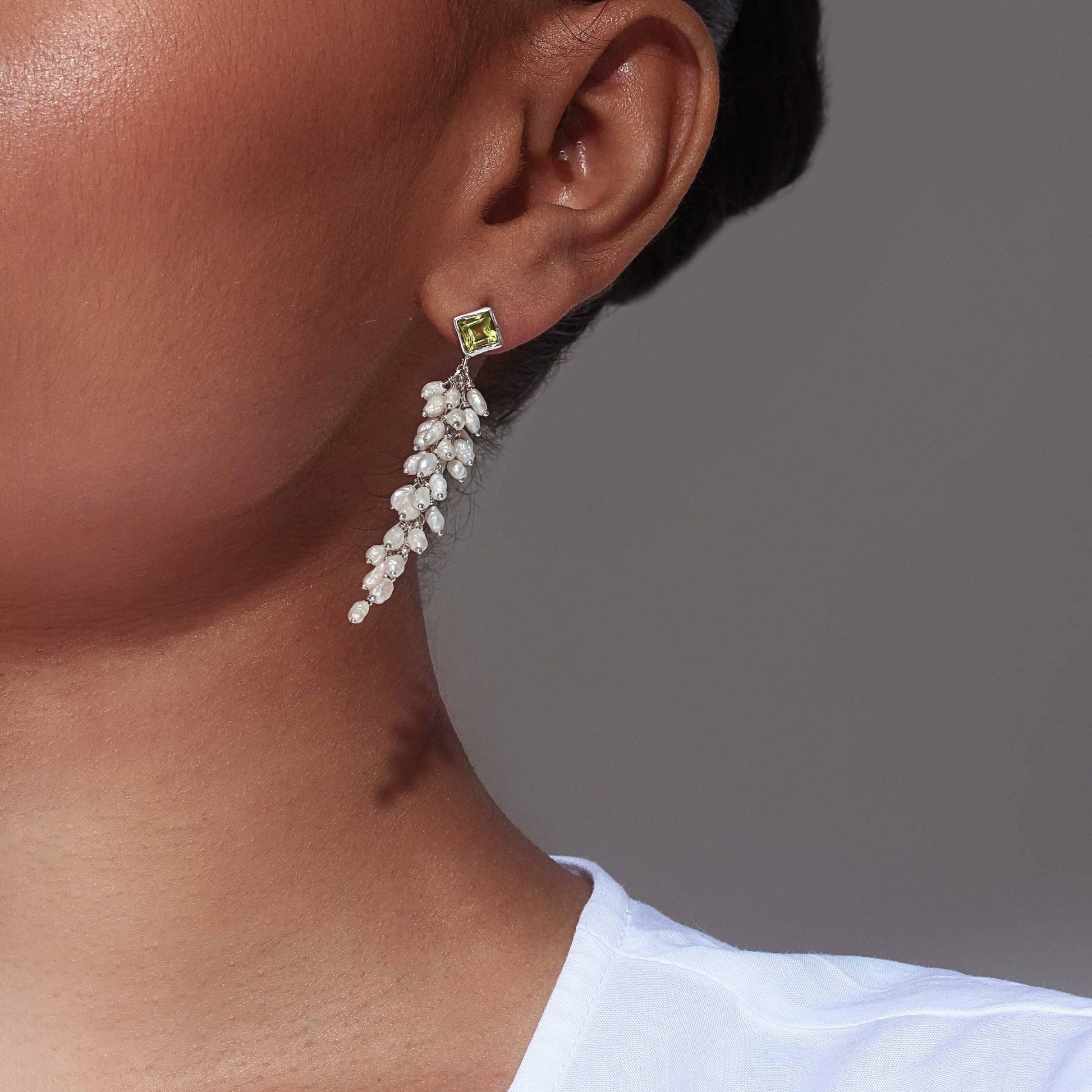 Peridot with its vibrant green shade is unique. These elegant earrings are set with 5mm square peridot gemstones from which oval, irregular pearls form a cascade drop. They have a lovely movement, shape and feel.
