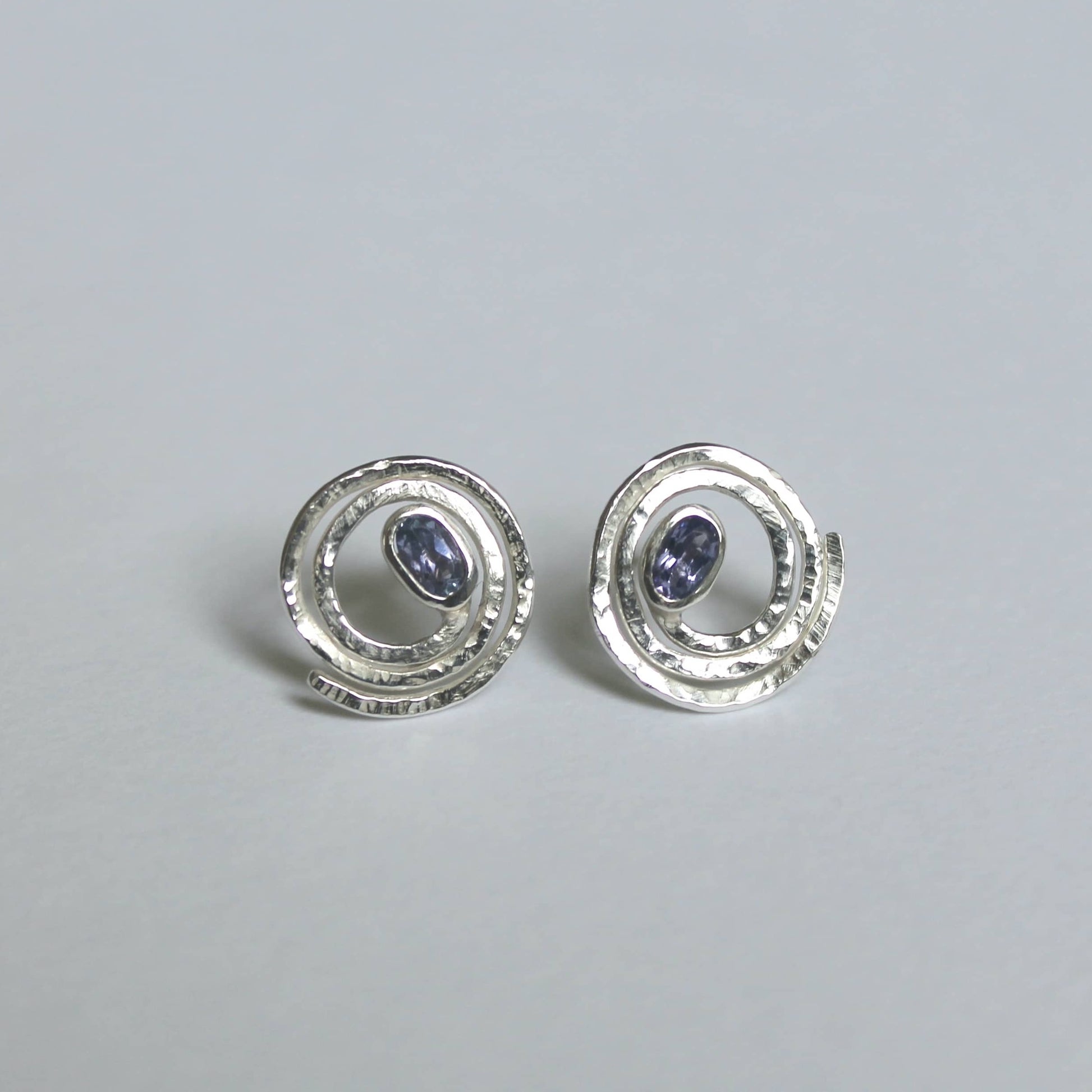 The spiral element of the filaree seed has been reimagined into these individually forged and hammered spiral silver earrings with peridot gemstones at their centres. Stud backs.