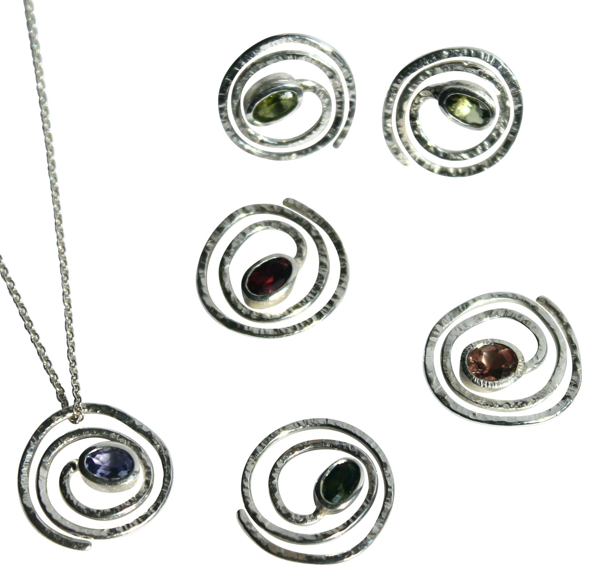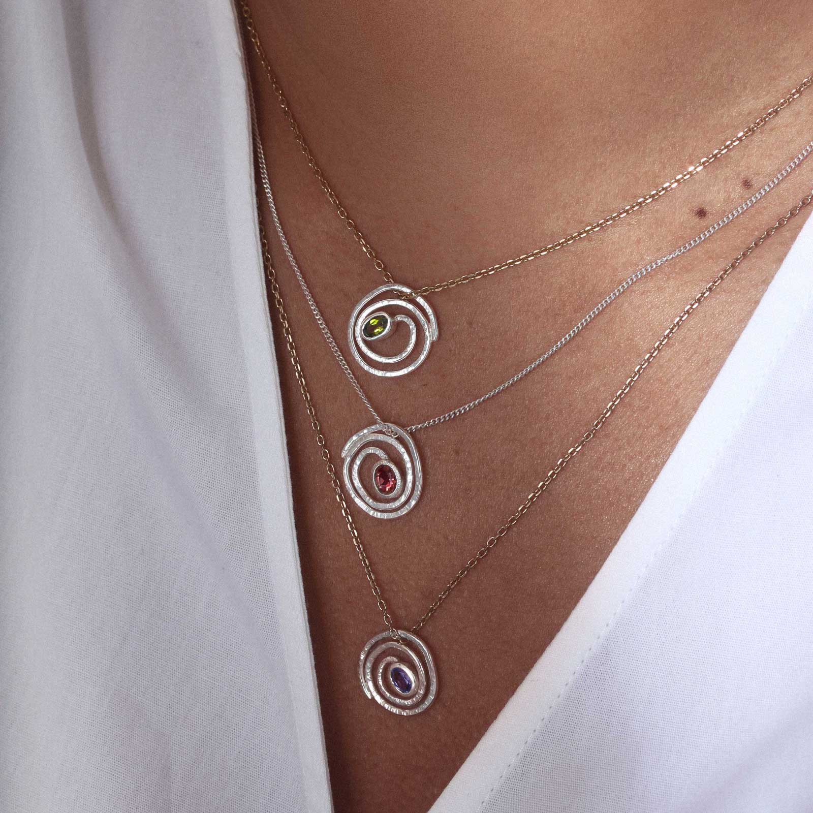 Individually forged and hammered silver spirals have been set with a stone at their centres and come on silver trace chain seen in the central spiral. Choose your gemstone at checkout.