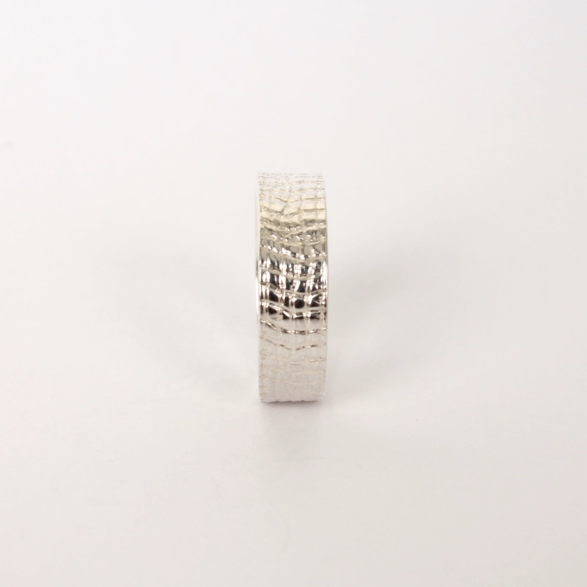 The textured pattern of this 10mm wide band as well as being visual is also tactile. Each one is handmade with its own print so they are small one-offs, similar but different, much like real skin.