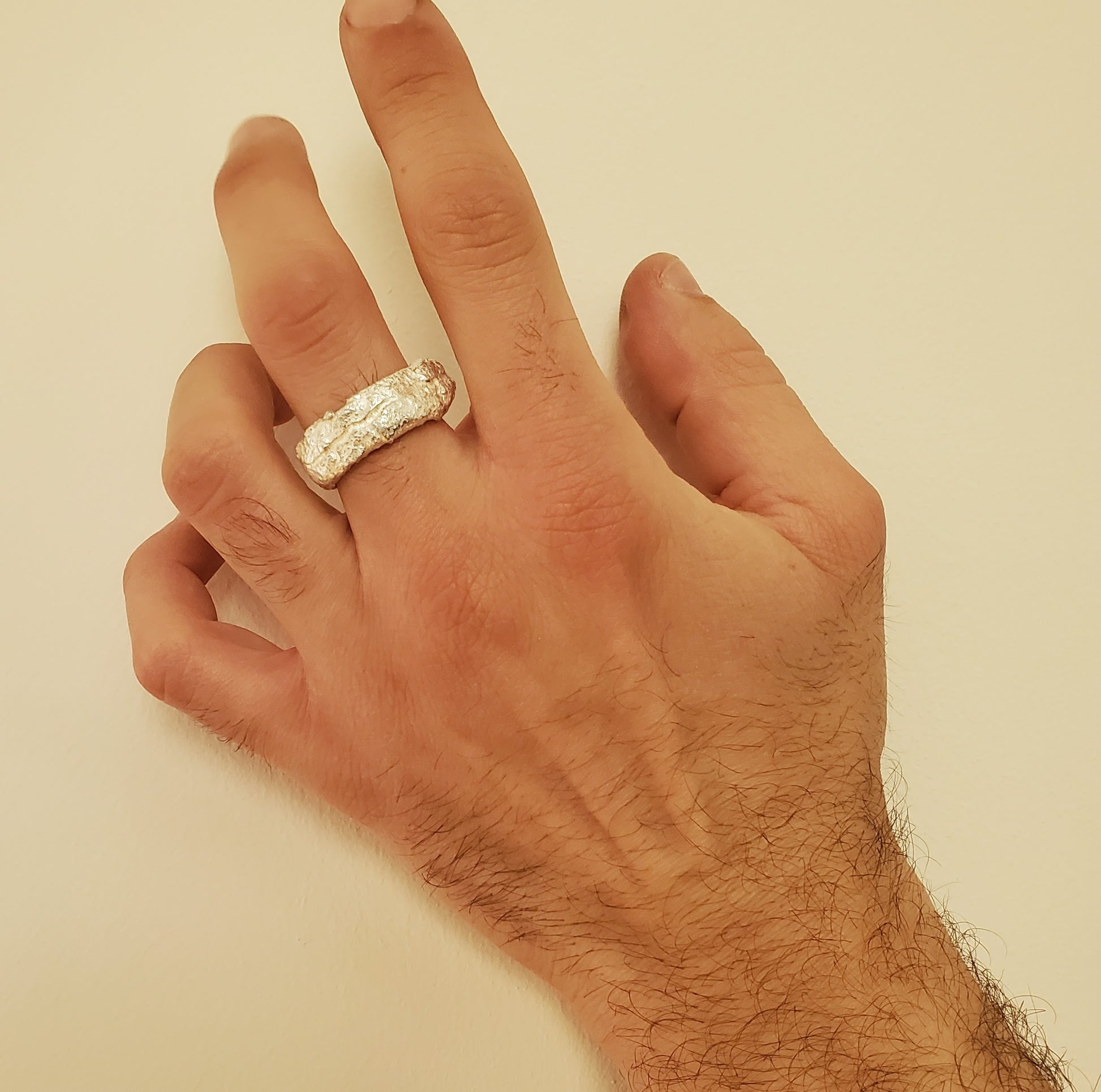 Heavily textured heat flowed metal with an engraved channel detail. The flow and roll of the metal with its unpredictability mimics the flow of water and signifies its preciousness.